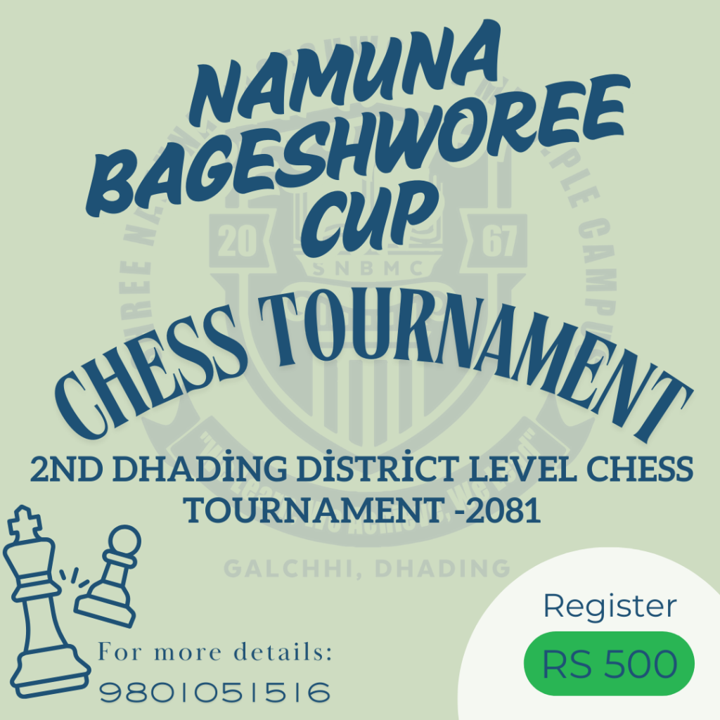 ३० माघ, धादिङ। नमुना बागेश्वरी बहुमुखी क्याम्पसको आयोजनामा यहि फाल्गुण १० गते जिल्ला स्तरीय बुद्धिचाल प्रतियोगिता हुने भएको छ। नमुना बागेश्वरी कप दोस्रो धादिङ जिल्ला स्तरीय बुद्धिचाल प्रतियोगितामा प्रथम देखि पाचौं स्थान सम्मका विजेता खेलाडीहरुलाई नगद पुरस्कार दिईनेछ। प्रथम हुनेले नगद रु १० हजार, ट्रफी, मेडल र सटिफिकेट पाउनेछन् भने दोस्रो र तेस्रो हुनेले क्रमशः […]