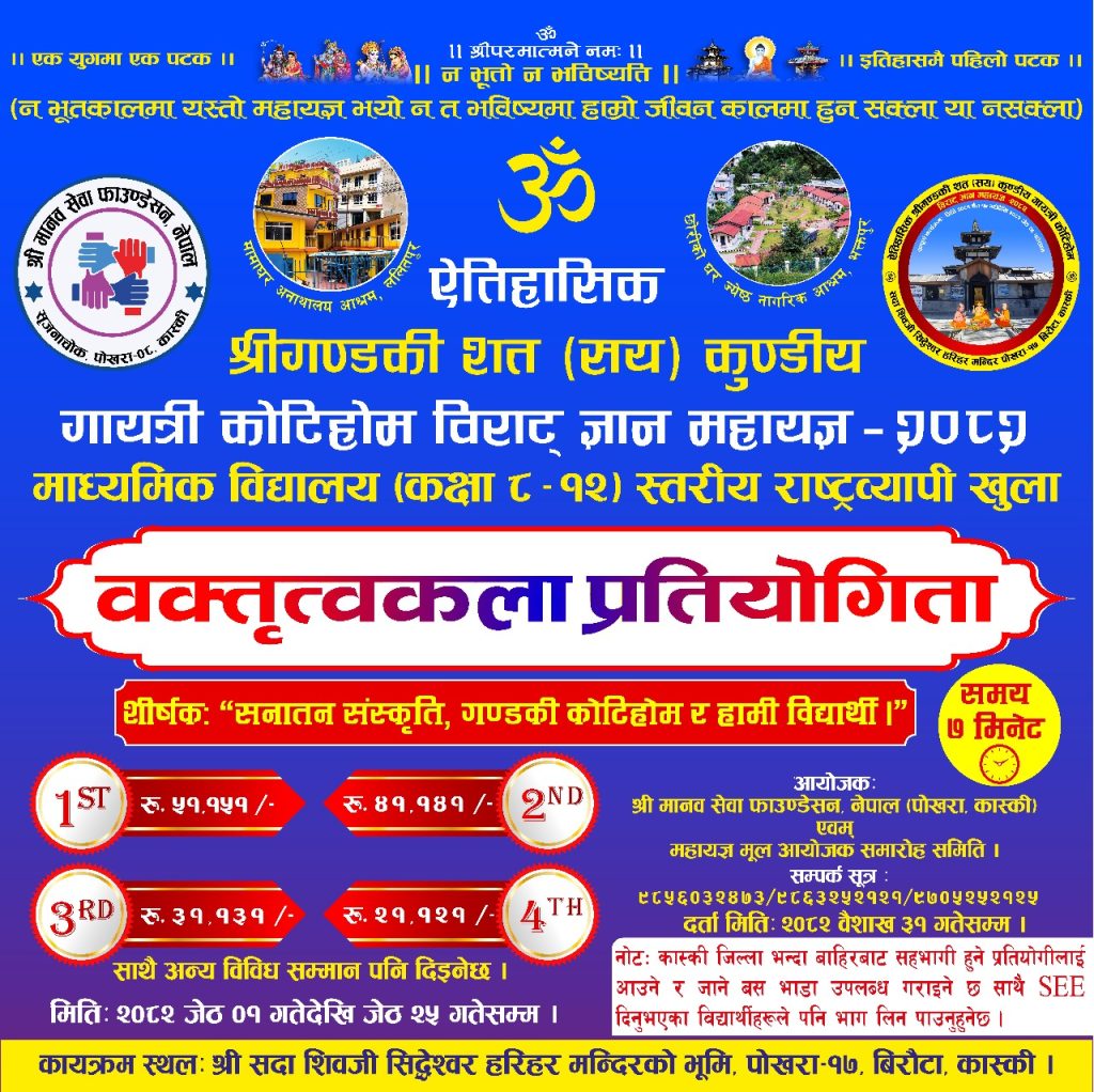 नयाँ पुस्ता भोलिको राष्ट्रका मार्गदर्शक हुन्। उनीहरूमा संस्कार, विचार र विवेकको बीज रोप्न सकियो भने मात्र समृद्ध समाजको निर्माण सम्भव हुन्छ। यही विश्वासका साथ ऐतिहासिक श्रीगण्डकी शत (सय) कुण्डीय गायत्री कोटिहोम विराट् ज्ञान महायज्ञ–२०८२ अन्तर्गत माध्यमिक विद्यालय (कक्षा ८–१२) स्तरीय राष्ट्रव्यापी खुला वक्तृत्वकला प्रतियोगिता आयोजना गरिएको छ। वक्तृत्वकला शिर्षकः “सनातन संस्कृति, गण्डकी कोटिहोम र […]