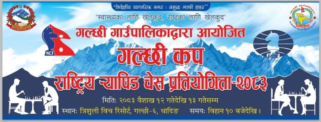 धादिङ — गल्छी गाउँपालिकाको आयोजनामा हुन गइरहेको “गल्छी कप” राष्ट्रिय र्यापिड चेस प्रतियोगिता–२०८३ को सम्पूर्ण तयारी पूरा भएको छ। प्रतियोगिता यही वैशाख १२ र १३ गते (अप्रिल २५–२६, २०२६) सञ्चालन हुने आयोजकले जनाएको छ। गल्छी गाउँपालिकाका अनुसार प्रतियोगिता त्रिशूली भ्यु रिसोर्ट, बैरेनीमा बिहान १० बजेदेखि सुरु हुनेछ। गल्छी गाउँपालिकाले प्रथम पटक आयोजना गरेको राष्ट्रिय प्रतियोगितामा […]
