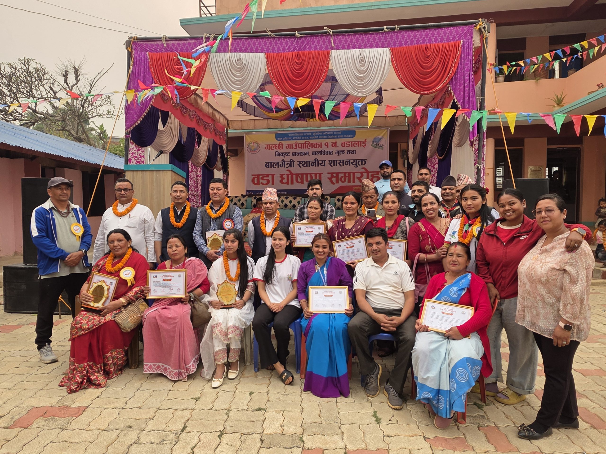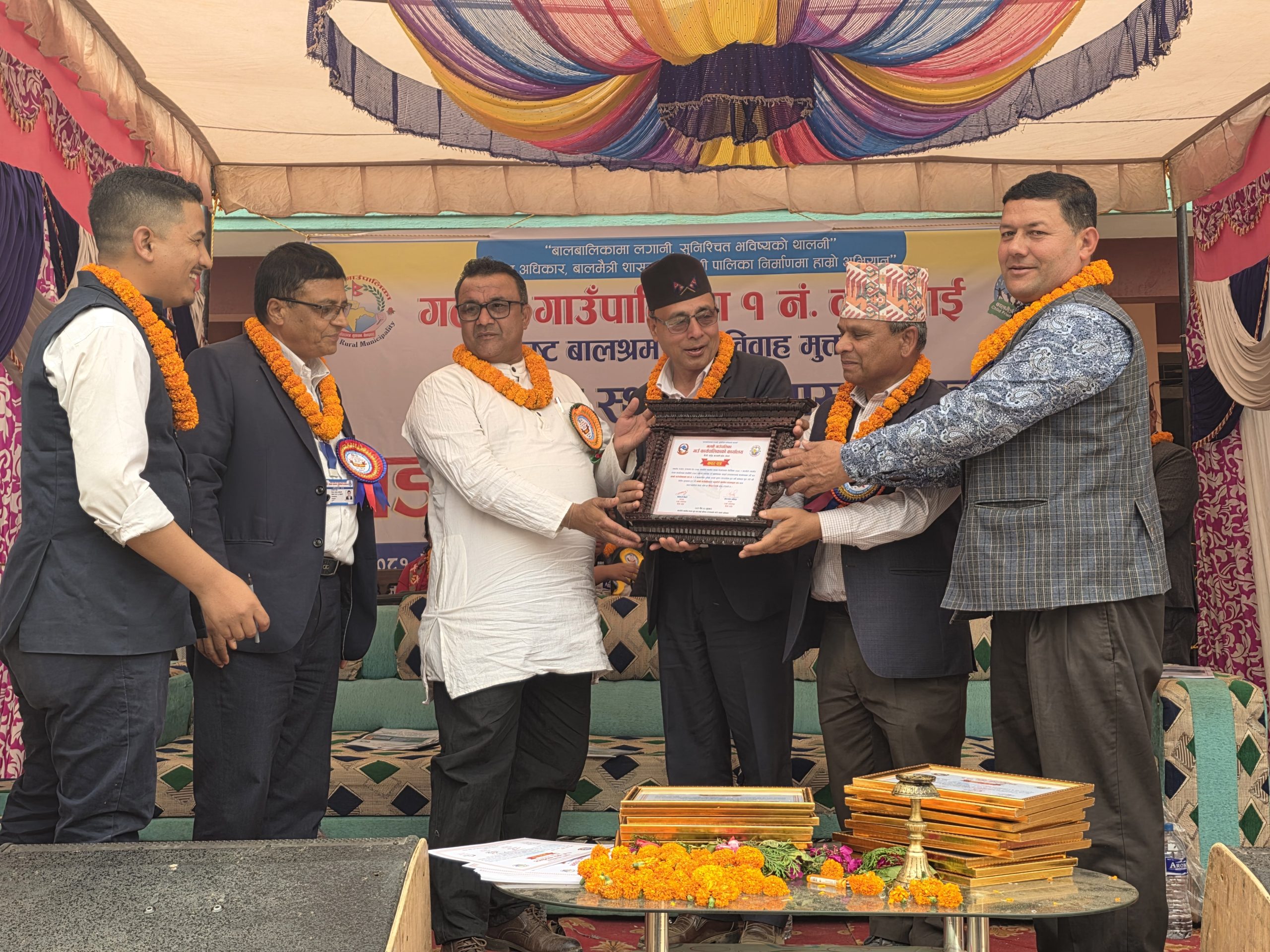 समारोहमा गल्छी गाउँपालिका अध्यक्ष केदारनाथ खतिवडाले वडा नम्बर १ का अध्यक्ष यदुकुमार खतिवडालाई बालमैत्री स्थानीय शासनयुक्त वडाको प्रमाणपत्र प्रदान गरे। कार्यक्रममा उपस्थित सबै सहभागीहरूले बालअधिकारप्रति पूर्ण प्रतिबद्धता जनाउँदै सामूहिक हस्ताक्षर गरे।