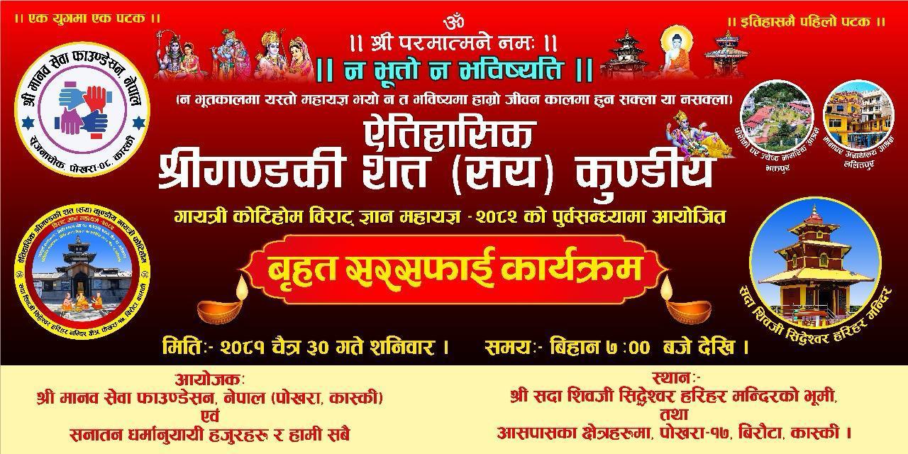 पोखरा, कास्की – ऐतिहासिक धार्मिक कार्यक्रम श्रीगण्डकी शत (सय) कुण्डीय गायत्री कोटिहोम विराट ज्ञान महायज्ञ–२०८१ को पूर्वसन्ध्यामा आउँदो शनिबार, चैत्र ३० गते श्रीगण्डकी कोटिहोम क्षेत्र तथा वरपरका स्थानहरूमा बृहत सरसफाई कार्यक्रम गरिने भएको छ।