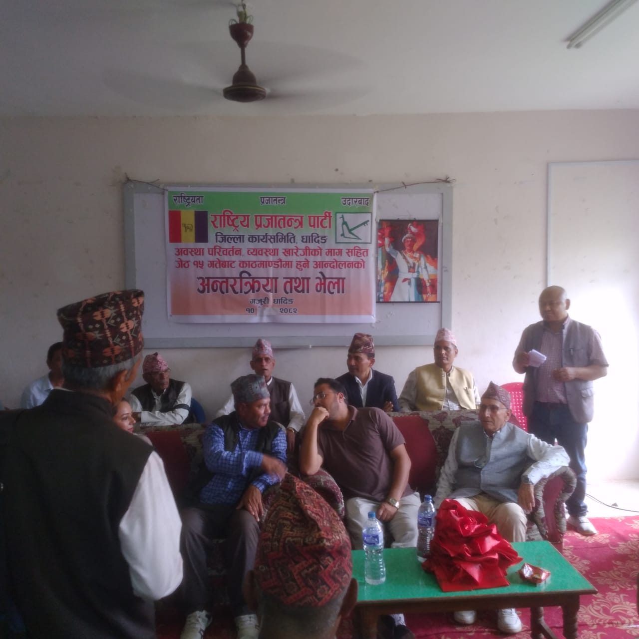 राजसंस्थाको पुनर्स्थापना, सनातन हिन्दु धर्म सापेक्ष हिन्दु राष्ट्रको घोषणा तथा संघीयताको खारेजीको मागसहित यही जेष्ठ १५ गतेदेखि काठमाडौंमा सुरु हुन गइरहेको अनिश्चितकालीन जनआन्दोलनको तयारीस्वरूप आयोजित कार्यक्रममा रा.प्र.पा. धादिङका अध्यक्ष धुर्वप्रसाद खनालको सभापतित्व रहेको थियो।