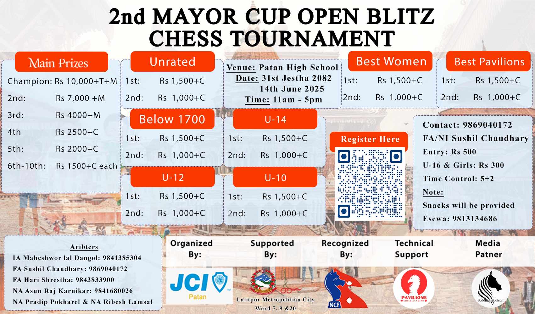 ललितपुर, जेठ २७ – पाटन जेसीसको आयोजनामा हुने दोस्रो मेयर कप खुल्ला ब्लिज रेटिङ्ग बुद्धिचाल प्रतियोगिता आगामी जेठ ३१ गते शनिवारका दिन पाटन स्कूल, पाटनढोकामा सम्पन्न हुने भएको छ। मानसिक विकास, रणनीतिक सोच, र अनुशासनको प्रोत्साहन गर्ने उद्देश्यले आयोजना गरिने प्रतियोगितामा करीब २०० जना खेलाडीहरूको सहभागिता रहने आयोजकले जनाएका छन्।