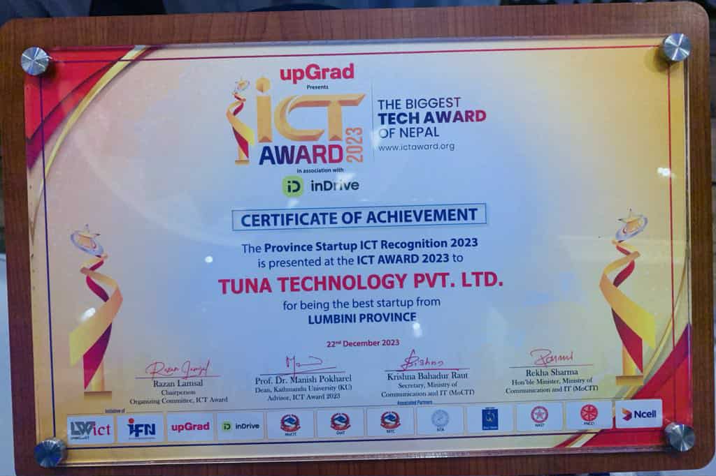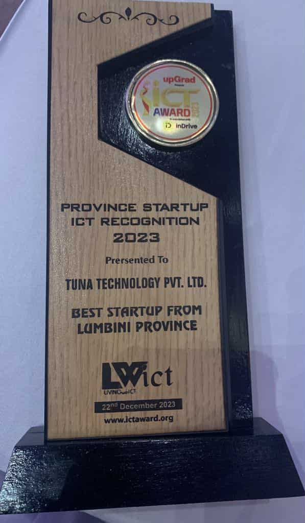 त्यस्तै, Province Startup ICT Recognition 2023 अन्तर्गत, ट्युना टेक्नोलोजीले “Best Startup from Lumbini Province” को उपाधि समेत प्राप्त गर्न सफल भएको छ। यो सम्मान Living with ICT द्वारा प्रदान गरिएको हो, जुन २२ डिसेम्बर २०२३ मा सम्पन्न भएको थियो।