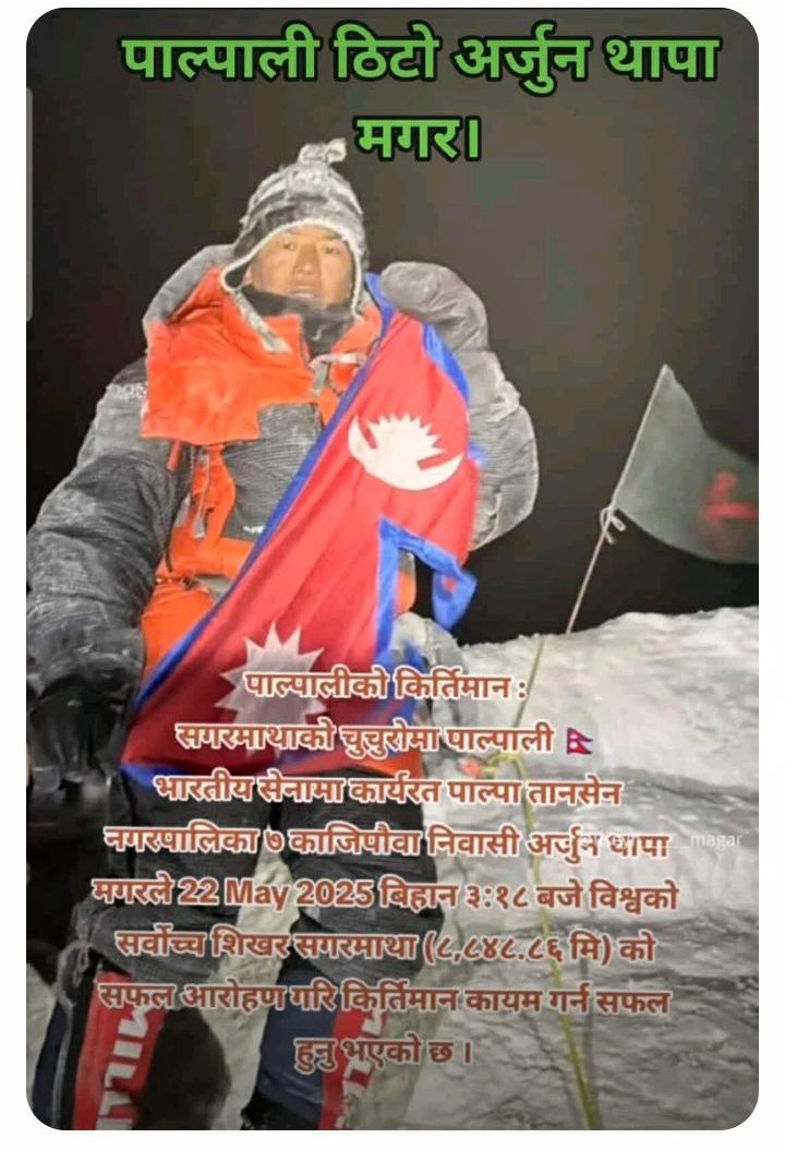 विश्वकै सर्वोच्च शिखर सगरमाथाको चुचुरोमा पाल्पालीको साहसले नयाँ कीर्तिमान कायम गरेको छ। पाल्पा तानसेन नगरपालिका–७ काजिपौवाका अर्जुन थापा मगरले २०८२ जेठ ८ गते बिहान ३:१८ बजे सगरमाथा (८,८४८.८६ मिटर) सफलतापूर्वक आरोहण गर्न सफल भएका छन्।