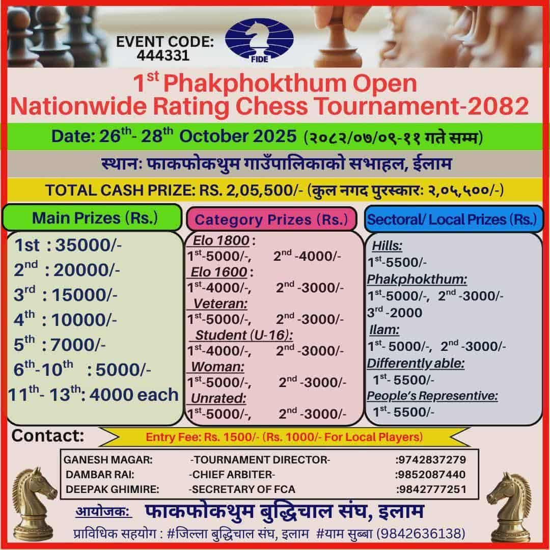 फिडे कोड ४४४३३१ अन्तर्गत सञ्चालन हुने यो प्रतियोगिता नेपालभरका खेलाडीहरूका लागि खुला रहनेछ। फाकफोकथुम चेस एशोसिएसन, इलामको आयोजनामा हुने प्रतियोगिता स्विस प्रणालीका आधारमा नौ राउन्डमा सम्पन्न हुनेछ। पहिलो राउन्डको पेयरिङ “एक्सेलेरेशन प्रणाली” अन्तर्गत हुनेछ। प्रत्येक खेलका लागि ६० मिनेटको समय तोकिएको छ, साथै पहिलो चालदेखि ३० सेकेन्डको इन्क्रिमेन्ट लागू हुनेछ। खेल सुरु भएको ३० मिनेटभित्र उपस्थित नभएका खेलाडीको खेल स्वतः रद्द हुने प्रतियोगिता निर्देशक गणेश मगरले जानकारी दिए।