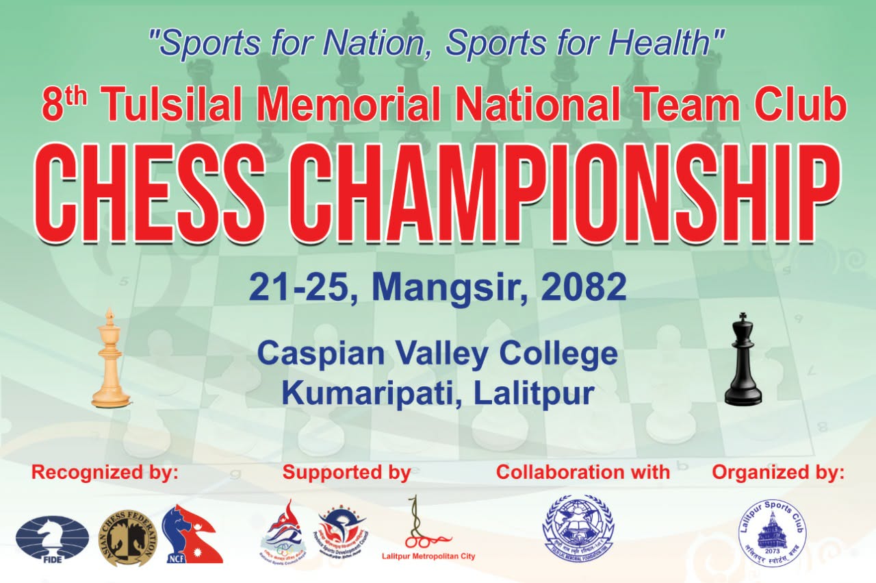 २० मंसिर, ललितपुर। ललितपुर स्पोर्ट्स क्लबको आयोजनामा हुने ८ औं तुल्सीलाल स्मृति राष्ट्रिय टिम चेस च्याम्पियनसिप आइतबारदेखि सुरु हुने भएको छ। प्रतियोगिताका सबै तयारी पूरा भएको संयोजक राजु ताम्राकारले जानकारी दिए।