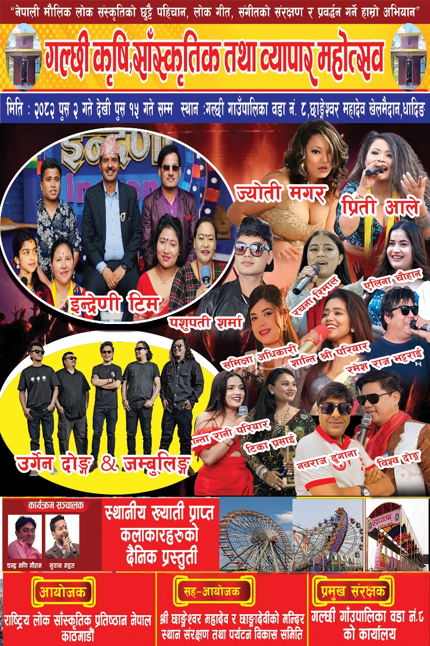 राष्ट्रिय लोक सांस्कृतिक प्रतिष्ठान नेपालको मुख्य आयोजनामा सञ्चालन हुने महोत्सव आगामी २०८२ साल पौष २ गतेदेखि पौष १५ गतेसम्म चल्नेछ। धादिङको गल्छी–८ मा तामाङ, मगर, क्षेत्री–ब्राह्मणलगायत विभिन्न समुदायको बसोबास छ भने यहाँको मुख्य पेसा कृषि हो। प्राकृतिक सुन्दरताले भरिपूर्ण यस क्षेत्रलाई महोत्सवमार्फत राष्ट्रियस्तरमा चिनाउने प्रयास गरिएको आयोजकको भनाइ छ।